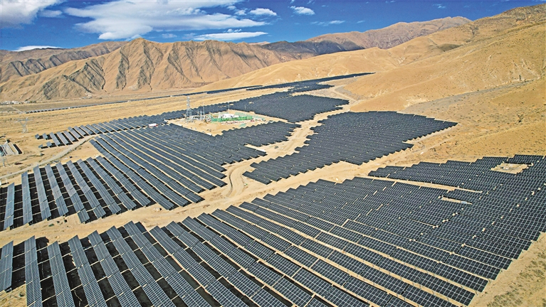 圖為瓊結(jié)縣白那村50兆瓦光伏儲(chǔ)能項(xiàng)目(無人機(jī)拍攝)。記者 旦增蘭澤 通訊員 倫珠澤仁 攝