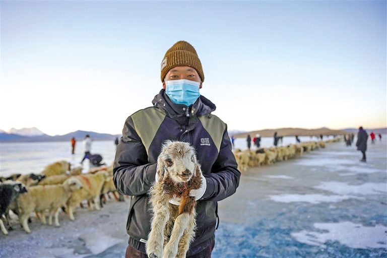 海拔5000米、3公里冰道,上千只羊,在牧羊人的護(hù)送下,從普莫雍錯(cuò)北岸涉冰踏雪,輾轉(zhuǎn)到湖心島過(guò)冬。這一沿襲千年的獨(dú)特牧業(yè)生產(chǎn)方式,是推瓦村人與大自然的默契,閃爍著古老的生存智慧。