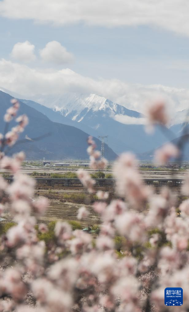 燦若云霞的桃花和潔白無(wú)瑕的雪山交織成一幅獨(dú)特的雪域高原美景(3月30日攝)。新華社記者 丁增尼達(dá) 攝