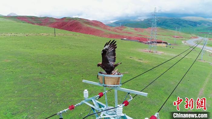 21日,在青海玉樹藏族自治州嘉塘草原,10千伏珍一路的67桿塔上,一只大鵟正在人工鳥巢內(nèi)孵化幼鳥。鳥巢下方,國網(wǎng)玉樹供電公司運(yùn)維檢修人員正在開展巡檢工作。