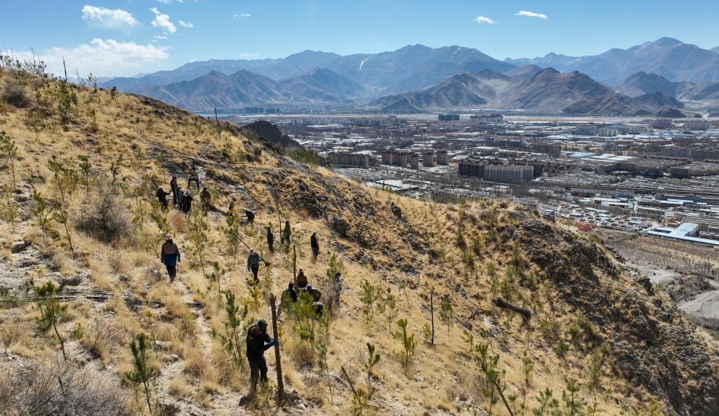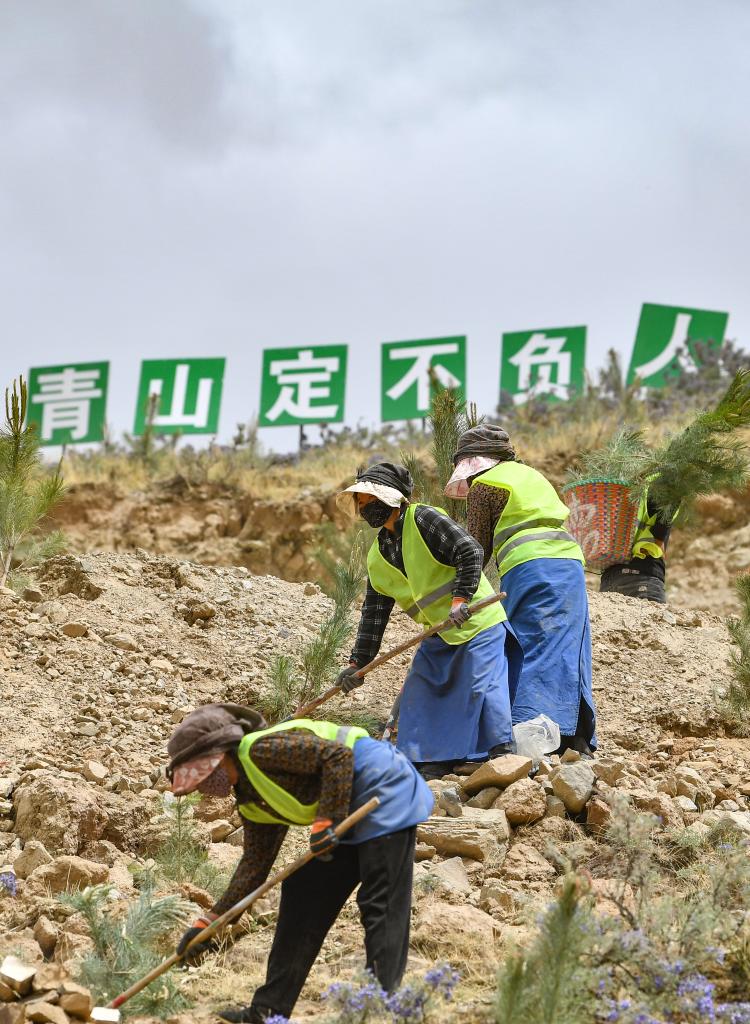 在拉薩南北山綠化2024年度一期工程貢嘎縣造林項目貢嘎2號片區(qū),當(dāng)?shù)卮迕裨谠詷湓炝郑?月3日攝)。新華社記者 晉美多吉 攝