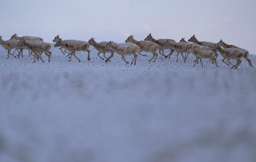 6月15日清晨雪后,在羌塘國家級自然保護區(qū),迎著朝霞前行在遷徙路上的一群藏羚羊。