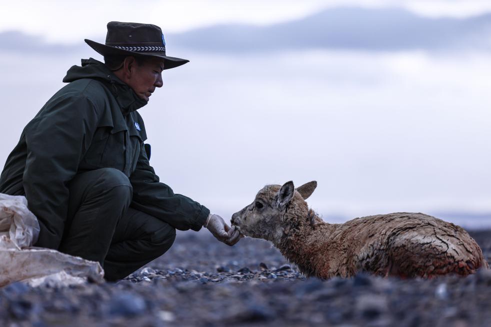 羅布嫻熟地用酒精清潔創(chuàng)面,手持針線慢慢地縫合她的肚皮——這場手術進行了50分鐘,母藏羚羊漸漸可以動了,她用鼻尖蹭了一下羅布的手,掙扎著起身,緩緩往東走去——那里是產羔地。
