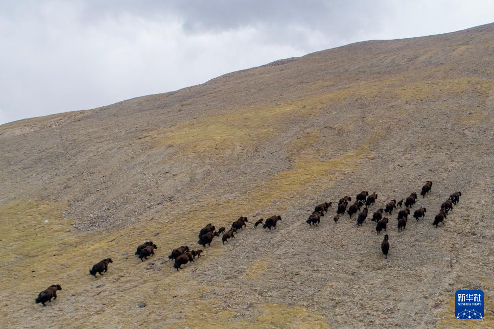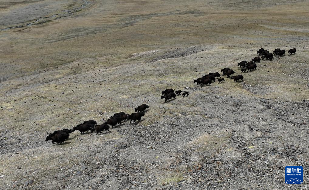 這是在那曲市尼瑪縣拍攝的野牦牛群,其中有剛出生不久的小牛犢(無(wú)人機(jī)照片,6月15日攝)。新華社記者 旦增尼瑪曲珠 攝