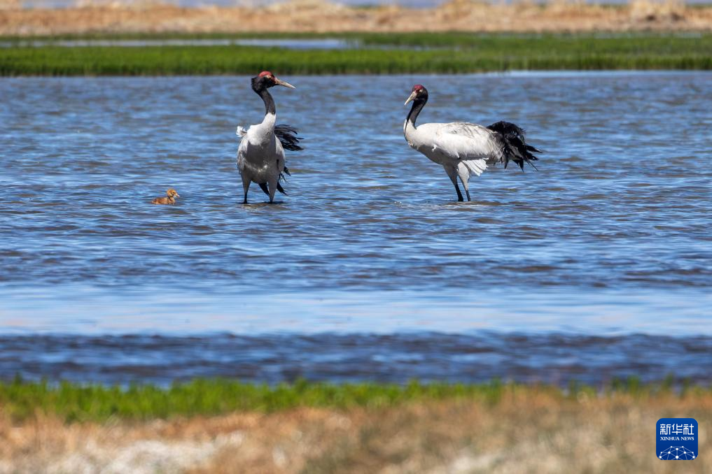 這是在那曲市申扎縣拍攝的養(yǎng)育雛鳥(niǎo)的黑頸鶴(6月9日攝)。新華社記者 姜帆 攝