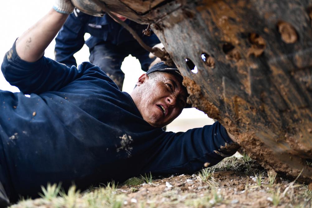 2020年7月6日,卓乃湖保護站站長秋培扎西在可可西里地區(qū)修理車輛。新華社記者 張龍 攝