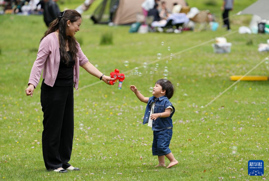7月14日,家長和孩子在“神秘樹林”的草地上玩泡泡機。新華社記者 張汝鋒 攝