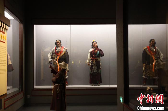 7月24日,參加“中國式現(xiàn)代化的萬千氣象·網(wǎng)絡(luò)名人青海行”活動的網(wǎng)絡(luò)名人,抵達(dá)江河源頭青海玉樹藏族自治州,在玉樹州博物館一覽自然與人文之美。玉樹州博物館是玉樹地震災(zāi)后重建十大標(biāo)志性建筑之一,分為序廳、自然展區(qū)、人文展區(qū)、臨時(shí)展廳。其通過實(shí)物標(biāo)本等方式,展示了三江源和可可西里的野生動物、草地、森林,以及玉樹州的歷史、建筑、服飾、飲食等。圖為玉樹州博物館內(nèi)的服飾文化展示。中新社記者 張?zhí)砀?攝