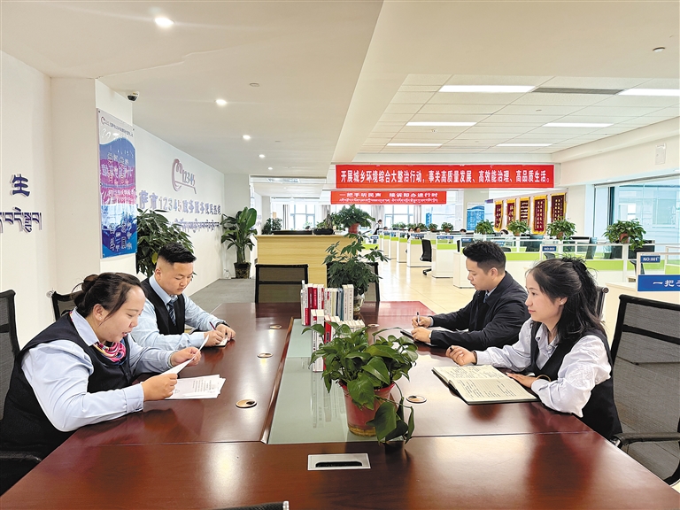 圖為拉薩市行政審批和便民服務(wù)局工作人員對12345疑難工單進(jìn)行討論。記者 盧文靜 攝