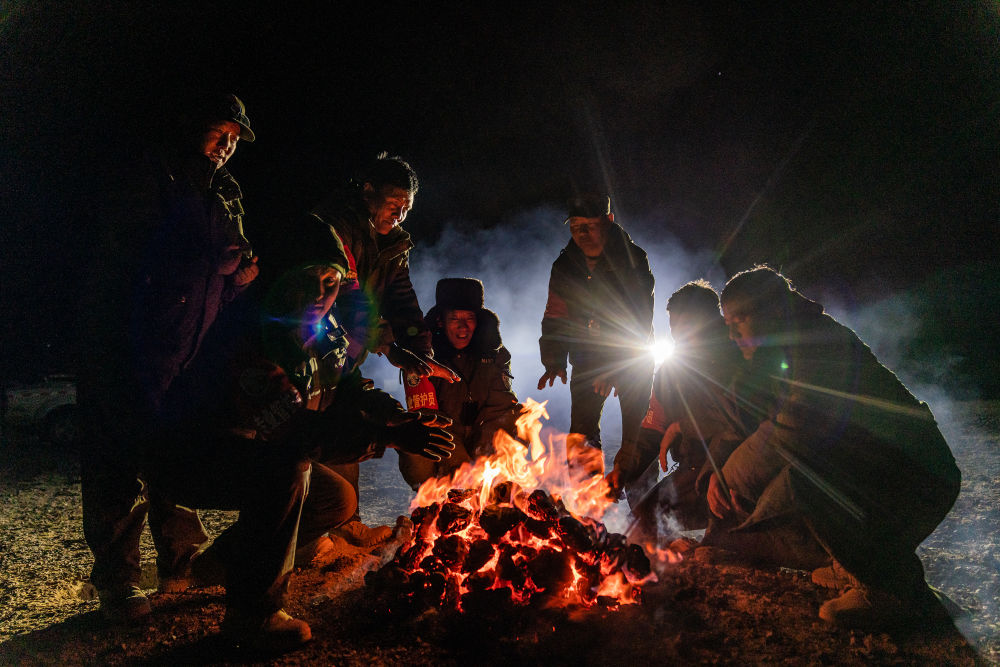 2024年5月10日,野生動物專業(yè)管護(hù)隊員在西藏羌塘國家級自然保護(hù)區(qū)的宿營地用野牦牛糞烤火取暖。