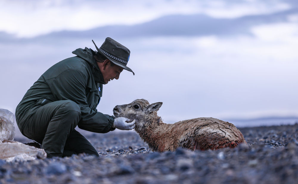 2024年6月14日,野生動物專業(yè)管護(hù)隊員在西藏羌塘國家級自然保護(hù)區(qū)核心區(qū)安撫受傷的母藏羚羊。