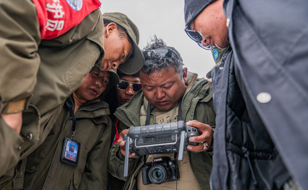 2024年5月10日,在西藏羌塘國家級自然保護(hù)區(qū),羅布玉杰管護(hù)站站長格桑倫珠(右二)和隊員們在大雪中操作無人機(jī)觀察藏羚羊遷徙情況。