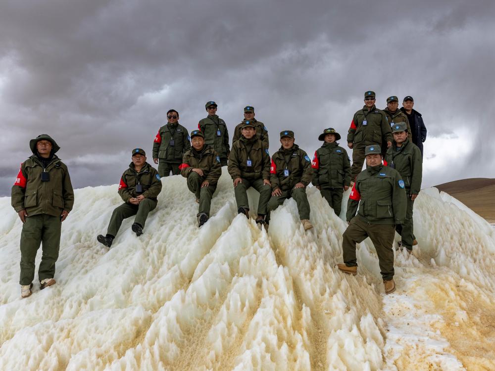 2024年5月7日,在西藏羌塘國家級自然保護(hù)區(qū),野生動物專業(yè)管護(hù)隊員在巡護(hù)路上一處埡口的冰雪堆上合影。