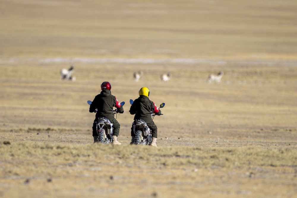 2023年12月17日,在西藏羌塘國家級自然保護(hù)區(qū),野生動物管護(hù)隊員騎著摩托車觀察藏羚羊。