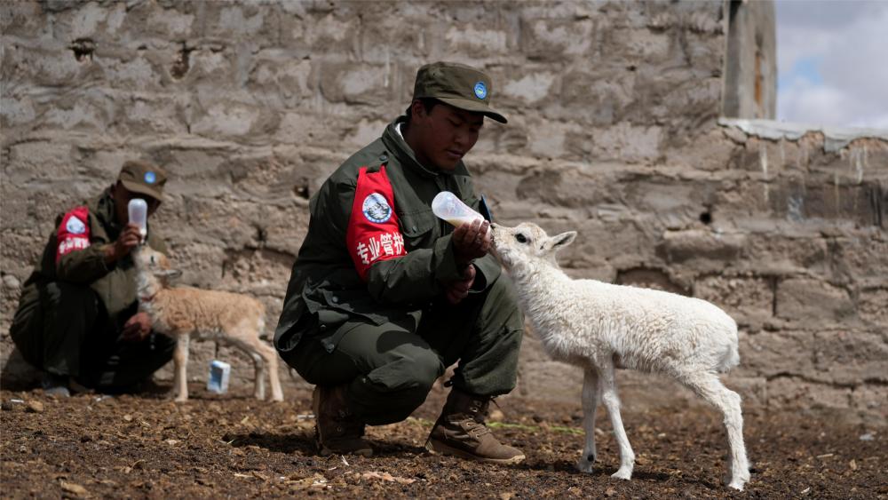 2024年7月13日,西藏那曲市尼瑪縣措羅木管護(hù)站野保員在給白色藏羚羊幼崽喂奶。