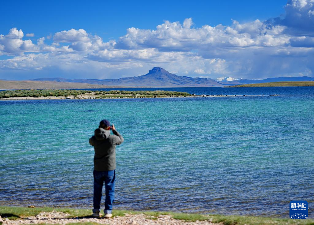 游客在錯(cuò)鄂湖畔拍照(8月25日攝)。新華社記者 張汝鋒 攝