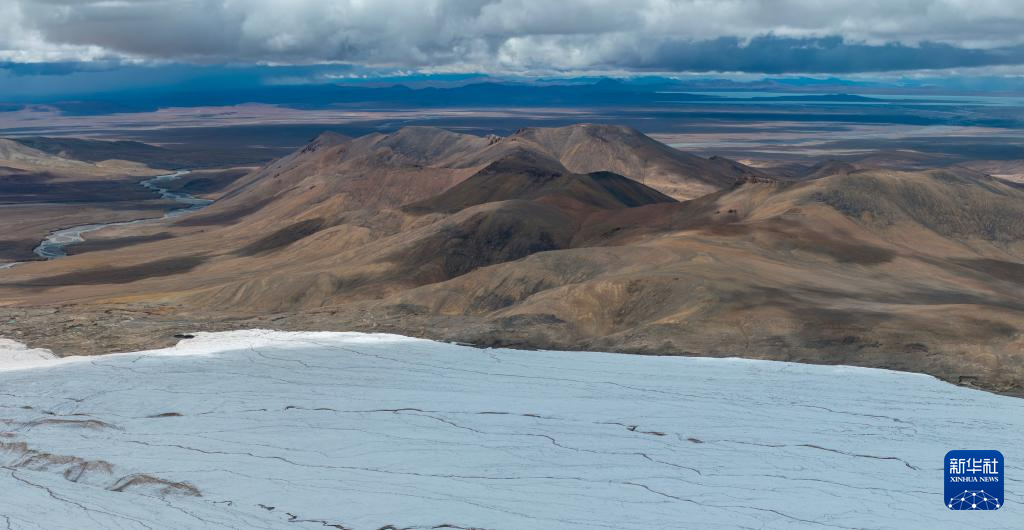 這是9月4日拍攝的普若崗日冰原8號冰川、消融形成的徑流以及遠(yuǎn)處的令戈錯(cuò)(無人機(jī)拼接照片)。新華社記者 姜帆 攝