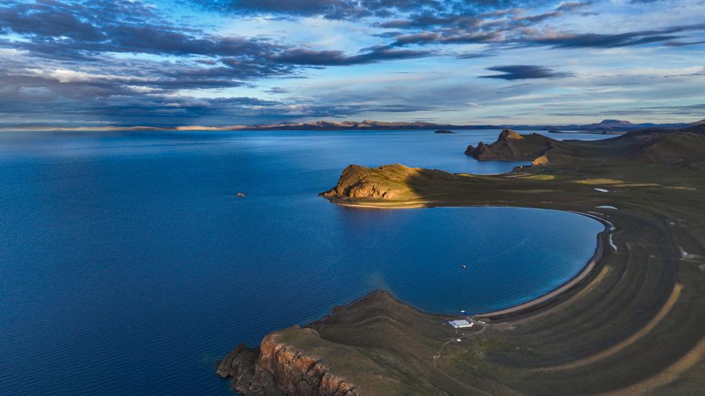 7月11日傍晚的納木錯(cuò)湖畔(無人機(jī)照片)。新華社記者 晉美多吉 攝