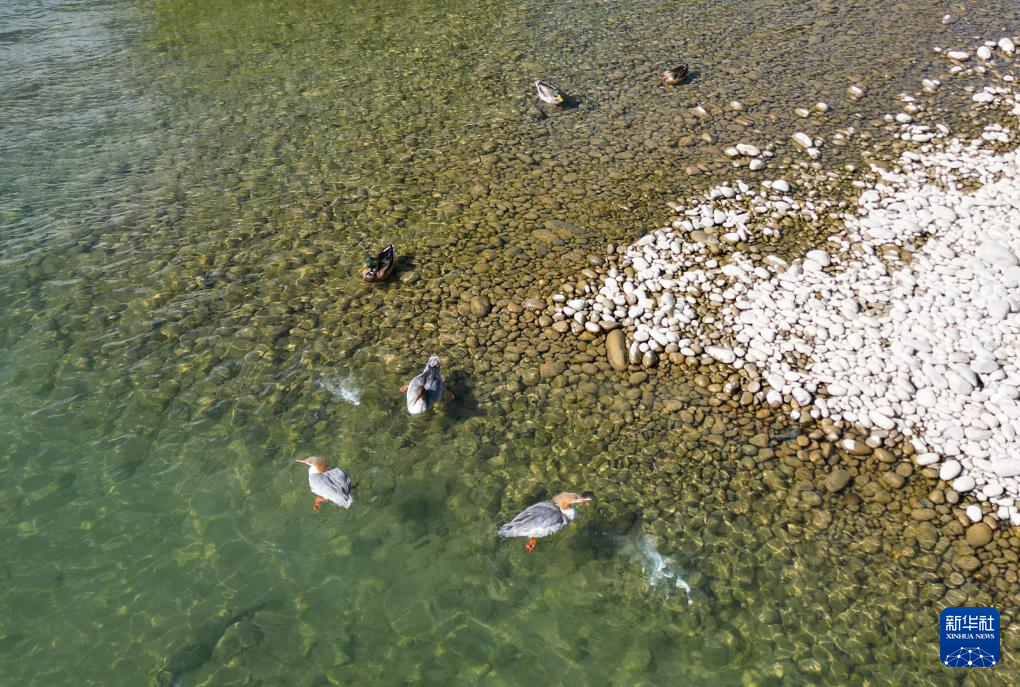 在林芝雅尼國(guó)家濕地公園內(nèi),不同種類的野生鳥(niǎo)類棲息在尼洋河畔(10月24日攝,無(wú)人機(jī)照片)。新華社記者 劉天宇 攝