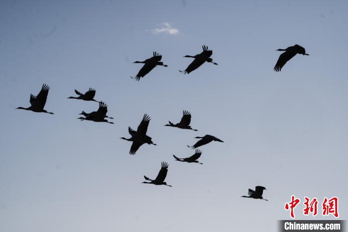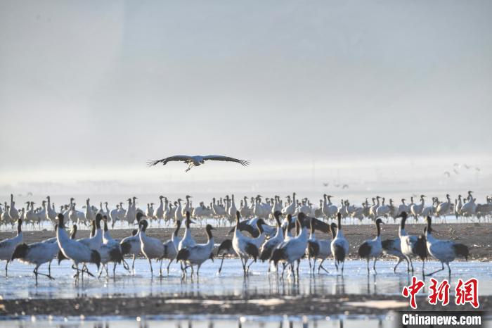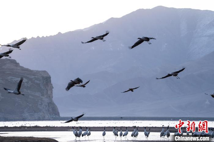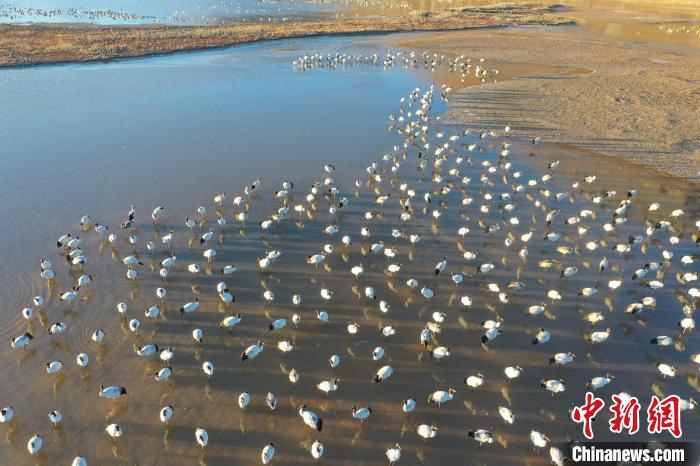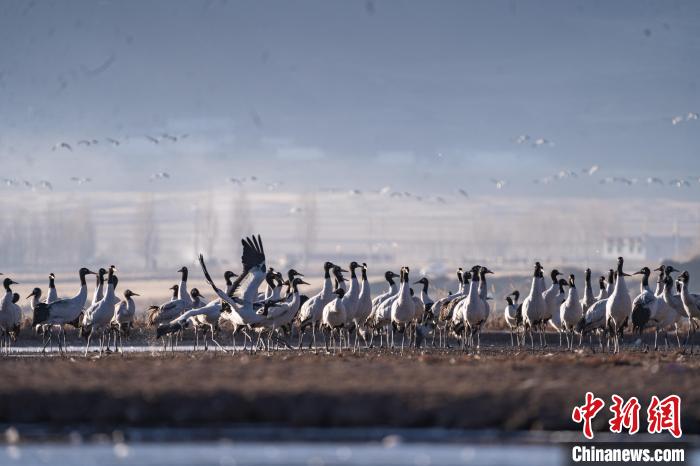 11月27日晨,西藏自治區(qū)拉薩市林周縣黑頸鶴保護區(qū)內(nèi),大量越冬的黑頸鶴在虎頭山水庫覓食、嬉戲。林周縣位于拉薩河上游及澎波河流域,平均海拔約4200米,是黑頸鶴的主要越冬地之一。中新社記者 貢嘎來松 攝