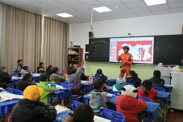 消防員向師生普及地震應急避險常識。記者 格桑倫珠 通訊員 仁青卓瑪 攝