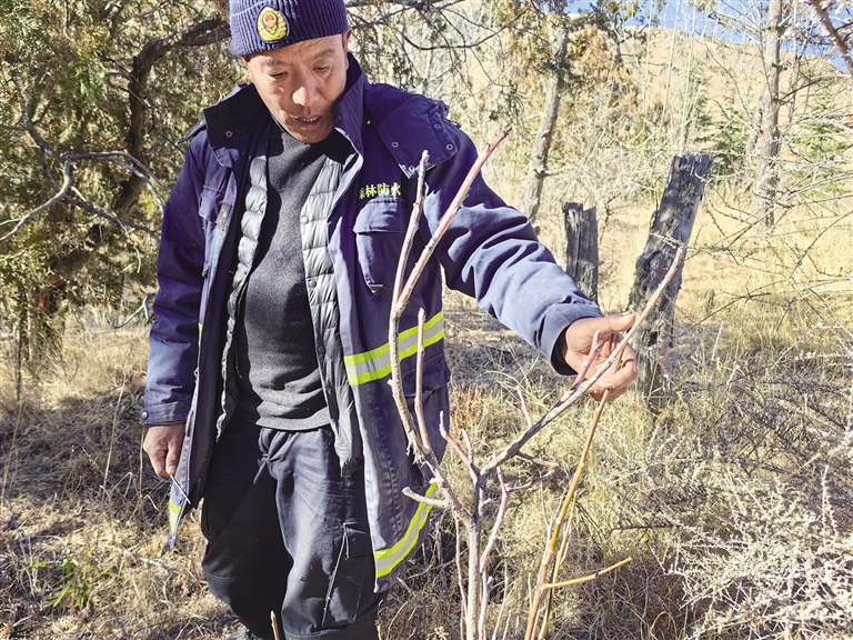 俗話說種樹“三分種、七分管”,在高海拔山上栽樹不易,管養(yǎng)更是難上加難。“你看那邊是自動(dòng)噴頭,山上的樹木要定期澆水,提高樹木的成活率?!痹髑嗾f,南山很多山體表面是碎石,土層特別薄。雨雪天氣后,山體表面儲(chǔ)存的水分很容易流失。山上栽樹時(shí),施工人員還從其他地方運(yùn)來很多土到山上。