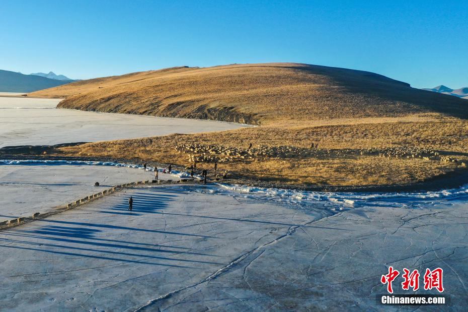 2月7日,西藏山南市浪卡子縣推瓦村1000多只羊通過普莫雍錯(cuò)冰湖,前往湖心島。據(jù)悉,位于西藏山南市浪卡子縣的推瓦村,平均海拔約5070米,是世界上海拔最高的行政村,以牧業(yè)為主。由于推瓦村海拔高、夏季短,草場(chǎng)無法為羊群提供充足的過冬飼料,因此,每年高原最冷的時(shí)候,推瓦村牧民會(huì)把羊群趕到普莫雍錯(cuò)水草豐茂的湖心島,依靠島上的草料度過最寒冷的冬期。圖為羊群到達(dá)湖心島。(無人機(jī)照片)