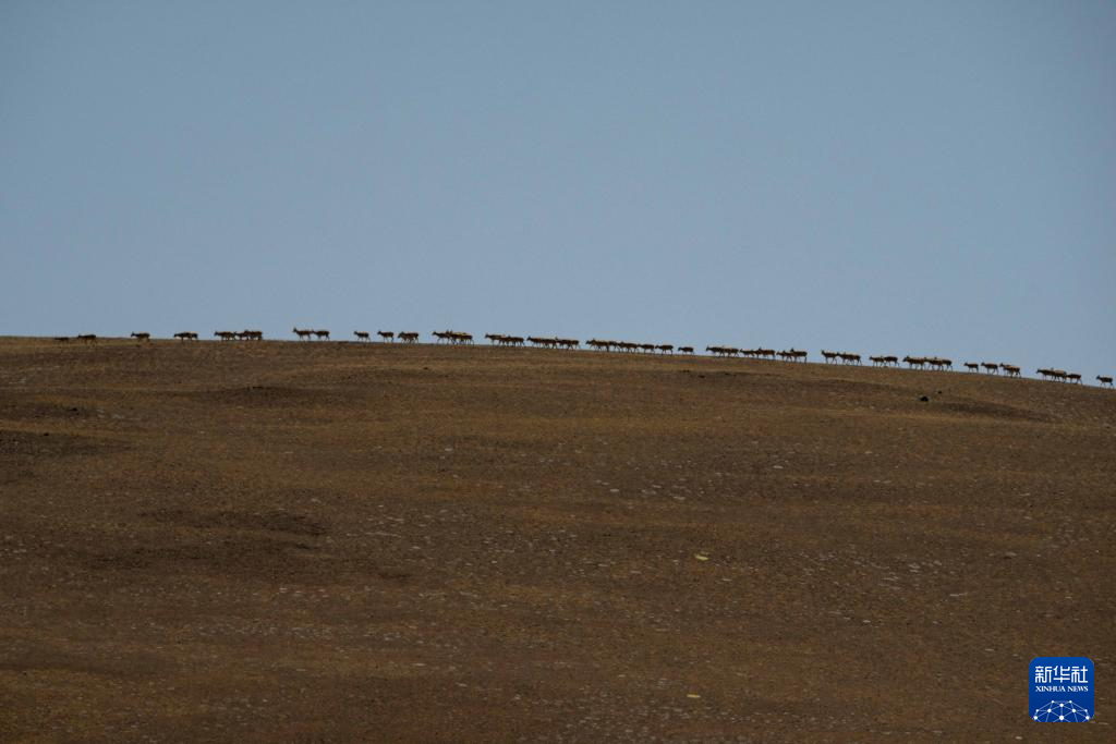 在羌塘國家級自然保護區(qū)核心區(qū)拍攝的遷徙中的雌藏羚羊群(6月9日攝)。新華社記者 旦增尼瑪曲珠 攝