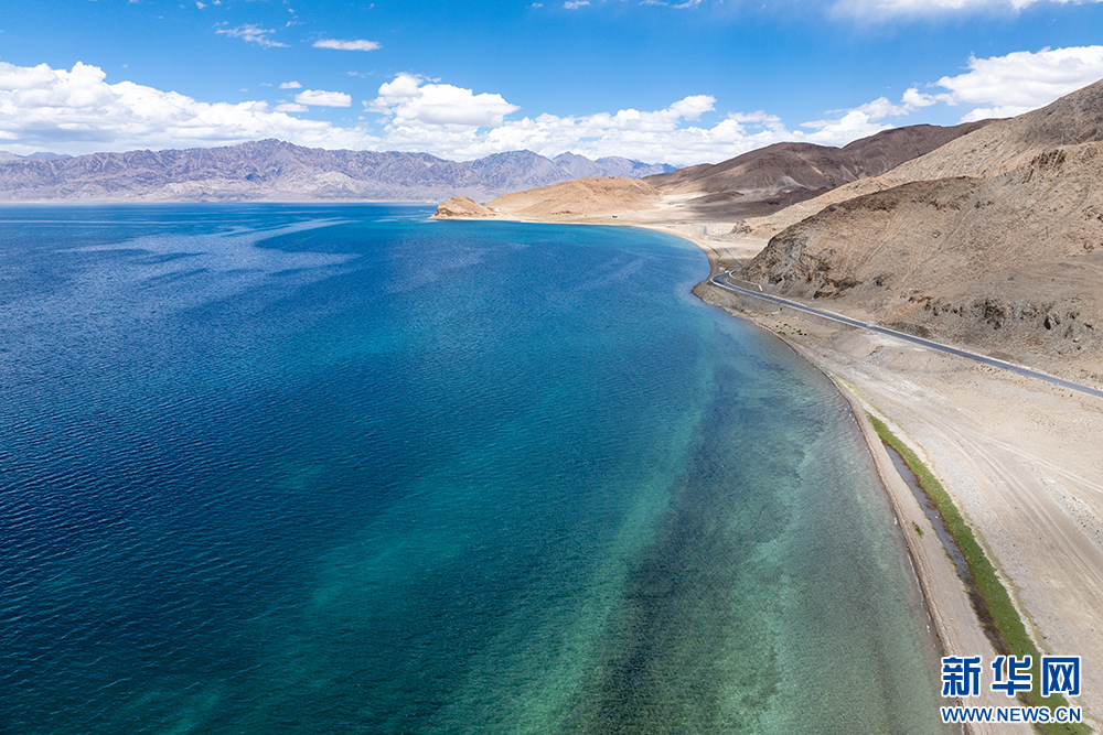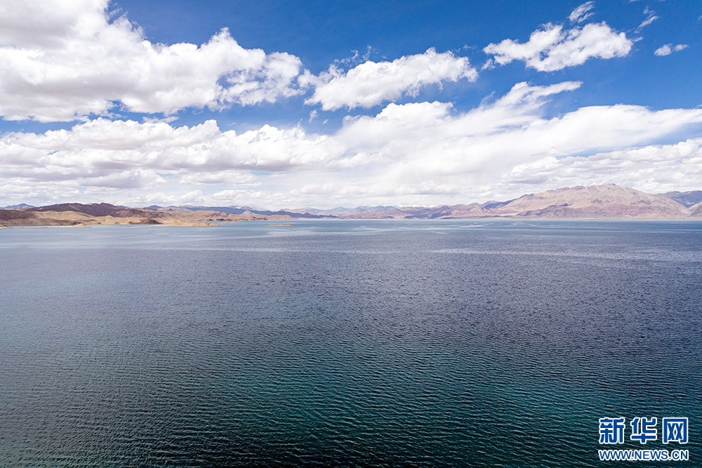 藍天白云映襯下的班公湖(6月15日攝,無人機照片)。新華網(wǎng) 旦增努布 攝