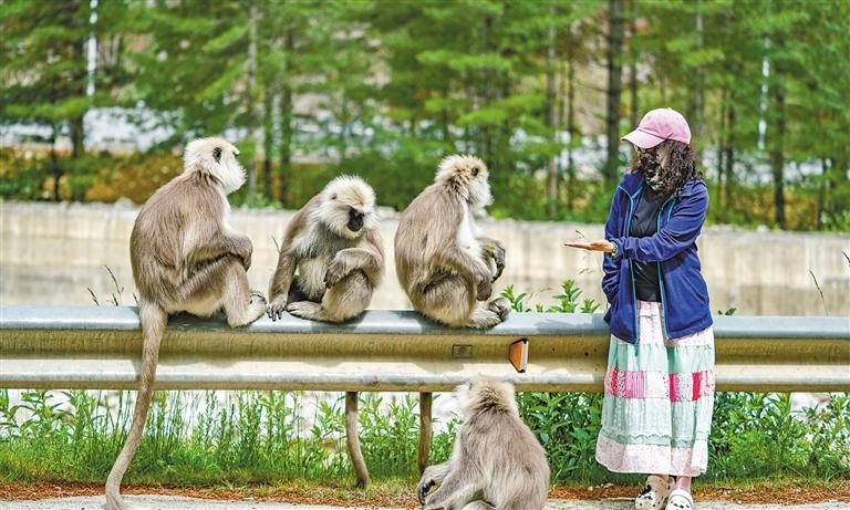 圖為6月20日,在亞?wèn)|縣一條公路邊,游客在和長(zhǎng)尾葉猴互動(dòng)。新華社記者 丁增尼達(dá) 攝