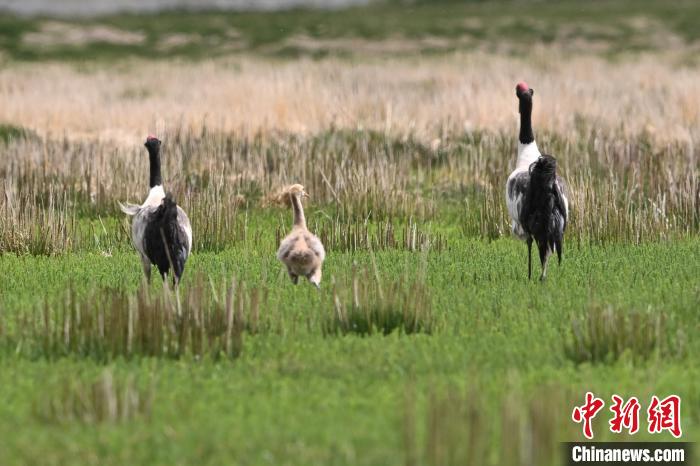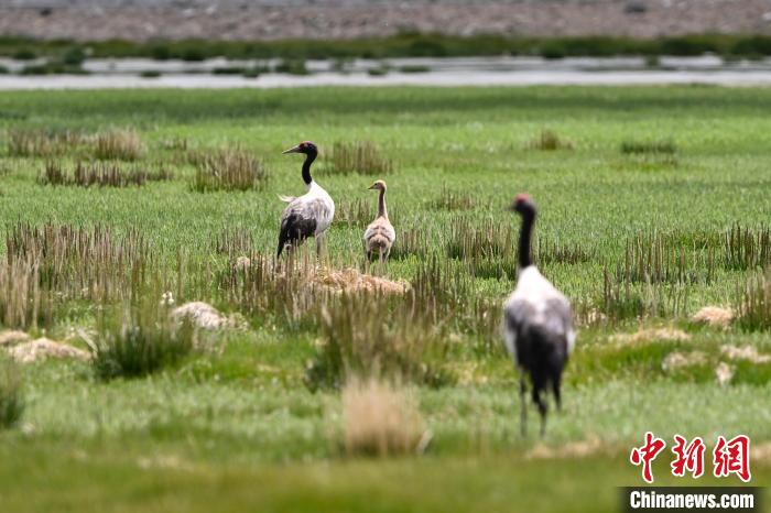 7月10日,在海拔4700米的西藏自治區(qū)那曲市申扎縣濕地里,黑頸鶴一家在悠閑覓食。黑頸鶴是中國國家一級重點保護(hù)野生動物,屬高原特有鶴類,主要棲息于海拔2500米至5000米的高原沼澤地、湖泊及河灘等濕地環(huán)境。每年四月起,成對的黑頸鶴陸續(xù)飛抵西藏自治區(qū)那曲市申扎縣,在此繁育后代。近年來,申扎縣持續(xù)加強生態(tài)修復(fù),濕地面積擴大、水質(zhì)改善,為黑頸鶴等珍稀物種提供了理想家園。中新社發(fā) 毛建軍 攝