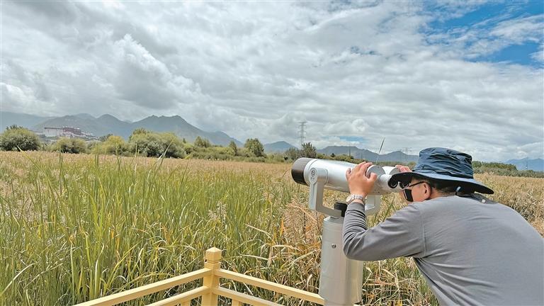 市民在拉魯濕地公園內(nèi)通過望遠(yuǎn)鏡觀賞布達(dá)拉宮。