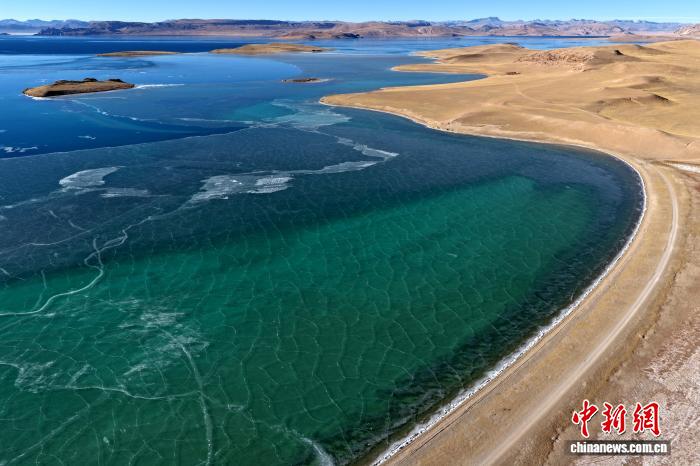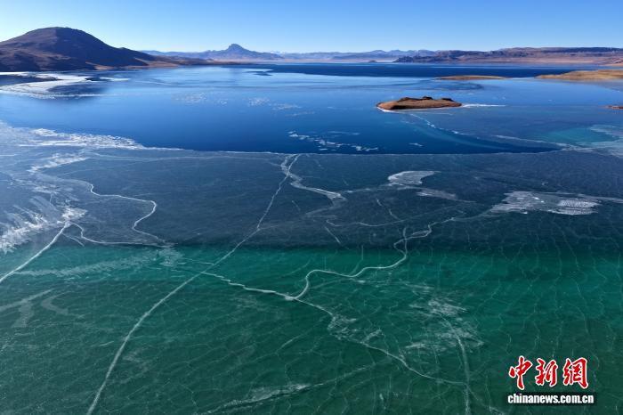12月20日,航拍錯(cuò)鄂湖。錯(cuò)鄂湖,位于西藏那曲市申扎縣境內(nèi),是色林錯(cuò)的衛(wèi)星湖。冬日錯(cuò)鄂湖在陽(yáng)光照耀下,湖泊呈現(xiàn)藍(lán)、綠等多種顏色,景色迷人。圖為錯(cuò)鄂湖景色。(無(wú)人機(jī)照片)中新社記者 李林 攝