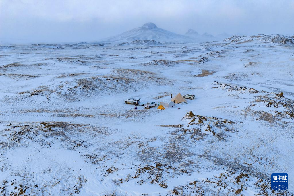 4月11日,羌塘國(guó)家級(jí)自然保護(hù)區(qū)那曲地區(qū)管理局專(zhuān)業(yè)管護(hù)隊(duì)在“巴毛窮宗”地區(qū)雪中宿營(yíng)(無(wú)人機(jī)照片)。新華社記者 姜帆 攝