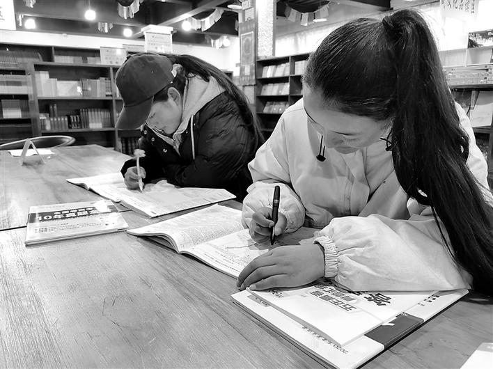 圖為西藏拉薩市第四高級中學(xué)的高三生強(qiáng)巴曲珍和白瑪在寒假期間來到圖書館做測試題,備戰(zhàn)今年6月的高考。記者 索朗瓊珠 攝