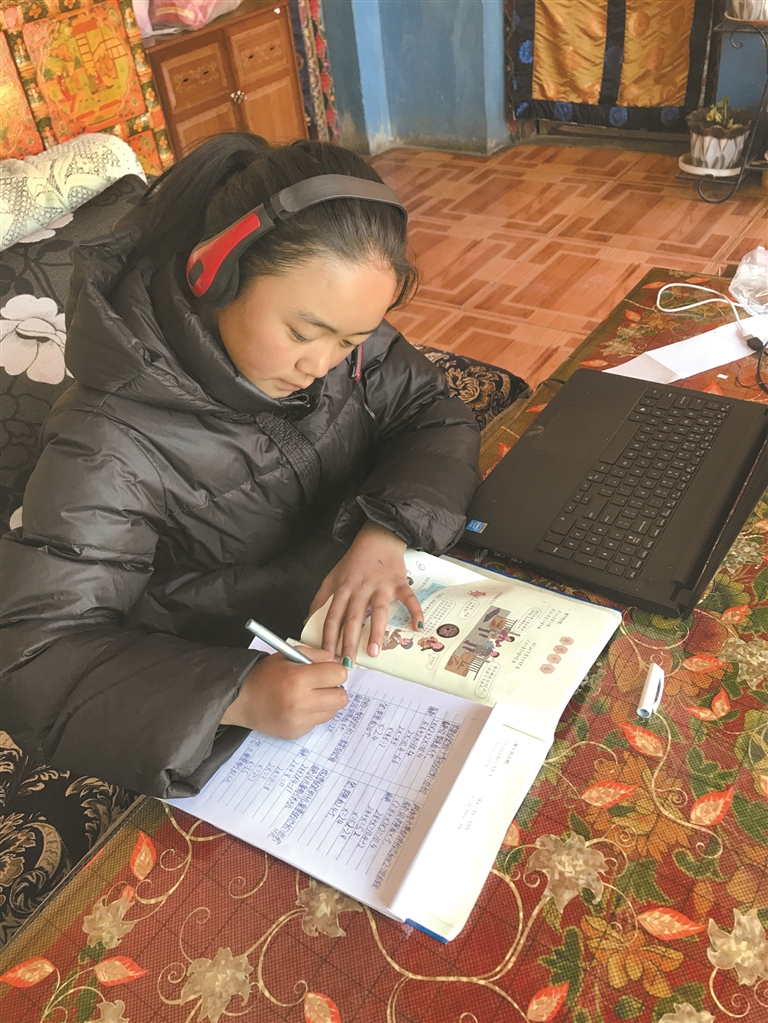 為西藏拉薩市曲水縣聶當(dāng)鄉(xiāng)小學(xué)五年級(jí)二班學(xué)生旦增拉姆在家上網(wǎng)課。圖片由曲水縣委宣傳部拉姆攝