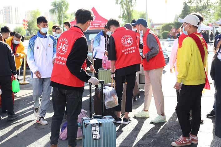 在西藏大學(xué)各學(xué)院的服務(wù)點(diǎn)前,新生在志愿者的幫助下進(jìn)行口罩替換、行李消毒、體溫測(cè)量、入校審批表核驗(yàn)等工作,核驗(yàn)無(wú)誤后,由志愿者幫忙運(yùn)送行李前往宿舍樓。