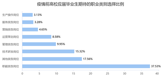 疫情前應屆畢業(yè)生期待的職業(yè)類別選擇比例由高到低依次為職能類型崗位(如行政、人事、財務等,37.53%)、其他類型崗位(17.56%)、技術研發(fā)崗位(如研發(fā)工程師、測試等,15.32%)、管理類型崗位(9.95%)、運營策劃崗位(如運營、產品、設計等,8.58%)、服務類型崗位(如客服、服務員、店員等,3.28%)、生產操作崗位(如職業(yè)業(yè)生產崗位等,3.13%)。疫情后和疫情前完全一致,選擇比例由高到低依次為職能類型崗位(37.65%)、其他類型崗位(18.08%)、技術研發(fā)崗位(14.67%)、管理類型崗位(9.79%)、運營策劃崗位(8.40%)、服務類型崗位(3.53%)、生產操作崗位(3.18%)。