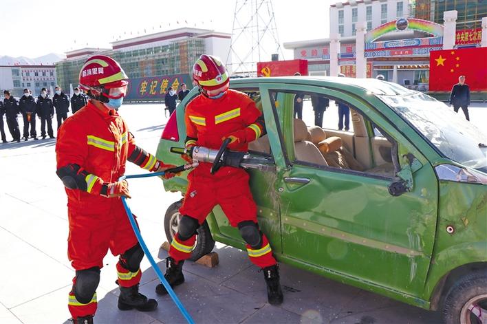阿里地區(qū)消防員在演示汽車破拆救援。