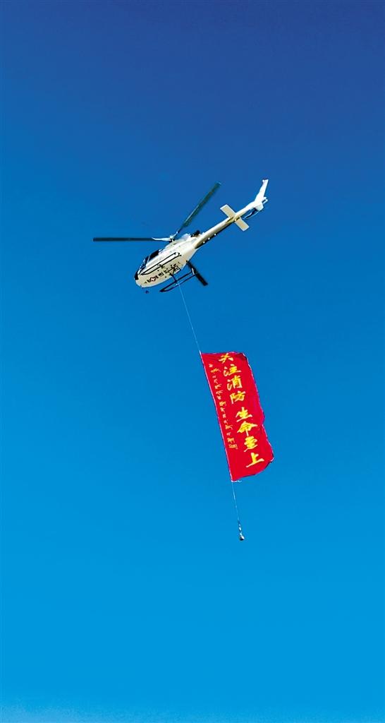 直升機(jī)攜帶”關(guān)注消防 生命至上“的標(biāo)語開展空中宣傳。