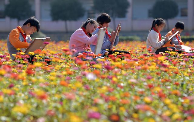 寨下鎮(zhèn)中心小學(xué)的學(xué)生們在花田寫生(11月9日攝)。新華社記者 彭昭之 攝