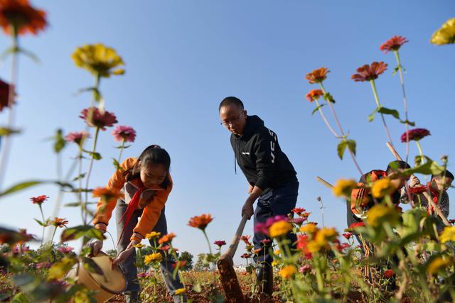 寨下鎮(zhèn)中心小學(xué)的學(xué)生們在花田勞動(dòng),給花松土、澆水(11月9日攝)。