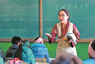 因?yàn)闊釔?,所以專注。青海省玉樹藏族自治州囊謙縣東壩鄉(xiāng)寄宿學(xué)校教師桑丁卓瑪,精心準(zhǔn)備每一堂課,認(rèn)真上好每一堂課,受到學(xué)生的喜愛。這是她在為五年級(jí)學(xué)生上漢語文課。