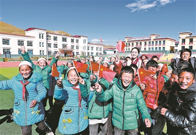 和學(xué)生們?cè)谝黄?,是桑丁卓瑪最開心的時(shí)刻。她專門給學(xué)生帶來國旗、國旗貼,為他們講述國旗下民族團(tuán)結(jié)好故事。
