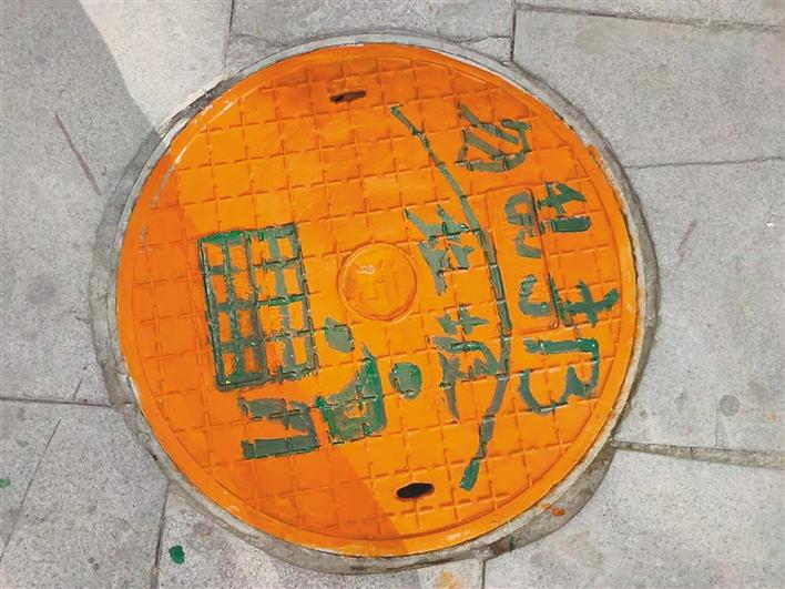 志愿者正在給井蓋涂鴉。記者 黃志武 攝