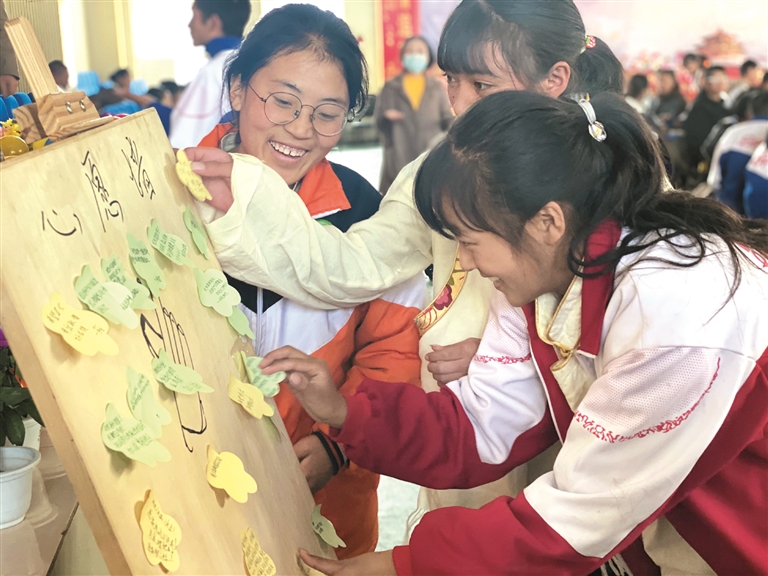 圖為學生在心愿墻上貼上自己的心愿。 旦增拉珍攝