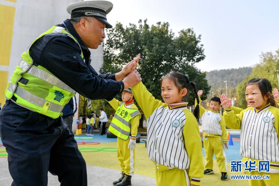 11月30日,交警在位于濟(jì)南市的山東省實(shí)驗(yàn)幼兒園南校區(qū)指導(dǎo)孩子們識別交通安全標(biāo)識牌。新華社發(fā)(郝群英 攝)