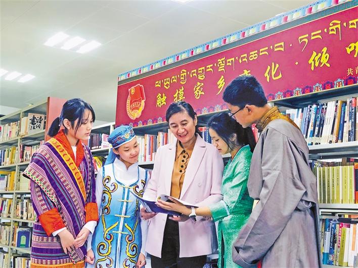 圖為共青團西藏自治區(qū)委員會副書記格桑卓瑪(左三)向武漢西藏中學(xué)的學(xué)生們介紹“觸摸家鄉(xiāng)變化·傾聽黨的聲音”主題書刊。央金 攝