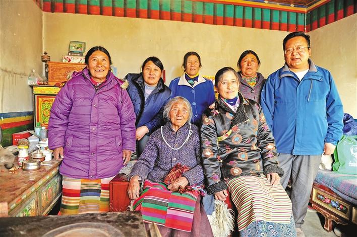 圖為烏巴·平措南加的妻子次仁卓嘎和6個子女合影,左二為格桑玉珍,右一為曲阿。記者 溫凱 洛桑旦增 達(dá)珍 攝