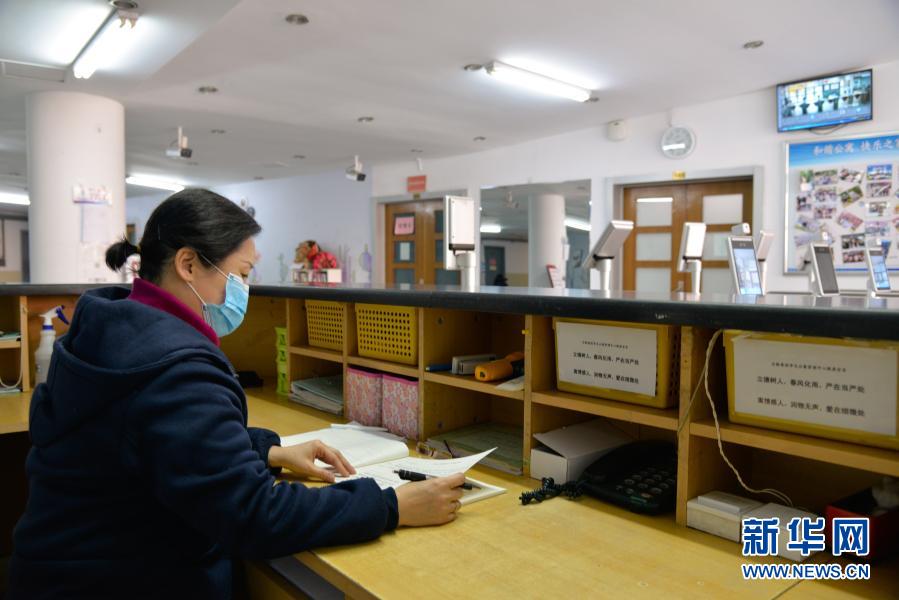 2月8日,北京交通大學(xué)學(xué)生公寓中心值班員李立在22號(hào)公寓大廳查看值班記錄。新華社記者 徐欽 攝